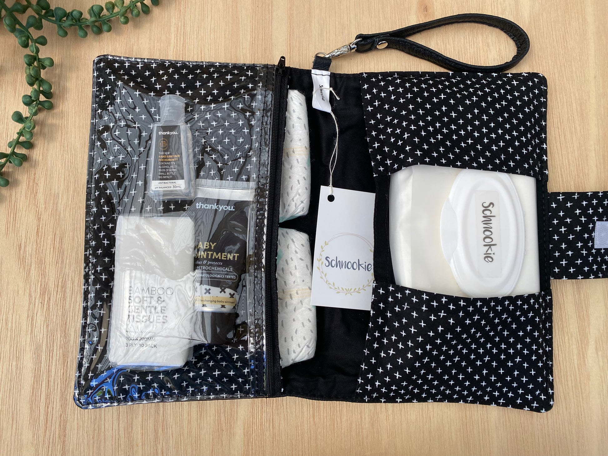 It features a timeless leather outer, modern fabric lining, 3 internal pockets including a see through section for creams etc, unique easy use wipes dispenser pocket, detachable leather wrist/pram strap and adjustable Velcro tab closure.
